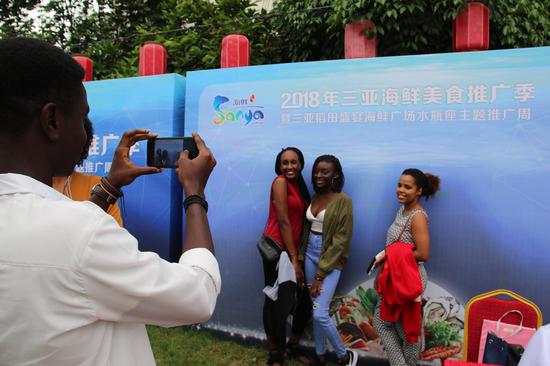三亚水稻国家公园稻田盛宴海鲜广场是海棠湾水稻国家公园原创开发的原生态餐饮体系,前期开发35亩,占地约2.3万平方米,可同时容纳2800人就餐,该海鲜广场通过打造稻田亲子观光+海鲜游,从不同的角度来推广三亚的海鲜餐饮文化。本站巡回展活动首日,三亚市旅游委利用暑期组织40多名在三亚工作的外籍教师前往水稻国家公园,参观极具中国特色的“稻文化”,外籍老师们走进田间地头,亲自在水田中体验了一把“洋农民”插秧的乐趣。参观结束后,外籍教师来到稻田盛宴海鲜广场,伴着欢快的竹竿舞,黎族风情浓郁的海鲜广场让这些生活在三亚的老外们颇感意外,见惯了三亚椰风海韵,混合着稻香阵阵的海鲜大餐让所有的人不禁食指大动。