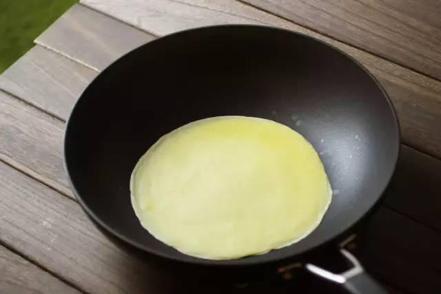 3、平底锅加热后转小火,舀一勺面糊入锅,转动,让面糊薄薄的均匀铺在锅底。等中间微凸,四周可以轻松剥离,倒出待用。
